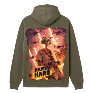Глубокий принт Party Hard на спине напоминает: настоящие решения принимаются наверху.